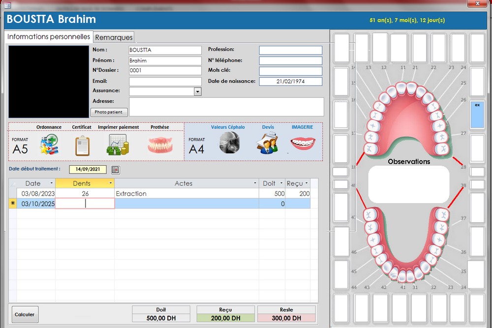 Actes➤ Ce module assure la liaison directe entre les soins effectués et la gestion financière du patient. À chaque consultation, le praticien peut enregistrer les actes réalisés (détartrage, extraction, soins prothétiques, etc.) en les sélectionnant depuis une base de données préconfigurée avec les tarifs correspondants, selon la nomenclature en vigueur. Chaque acte est associé automatiquement au dossier du patient