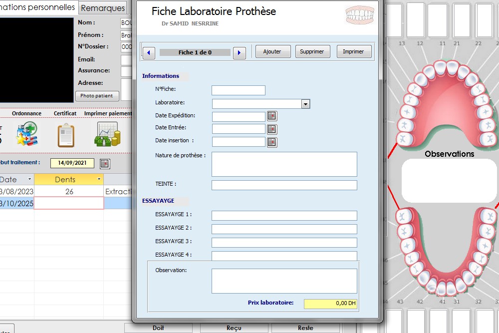 Prothèse➤Le module Prothèse est conçu pour gérer efficacement le suivi des travaux prothétiques envoyés au laboratoire, en assurant une traçabilité complète entre le cabinet dentaire et le prothésiste. Grâce à ce module, le praticien peut enregistrer chaque demande de travail prothétique (couronnes, bridges, inlays, prothèses amovibles, etc.) avec les détails techniques, la date de sortie vers le labo, le type de matériau, les teintes, ainsi que les instructions spécifiques pour le prothésiste.